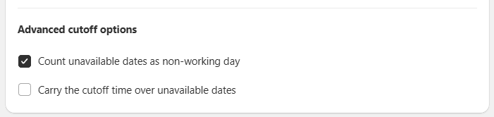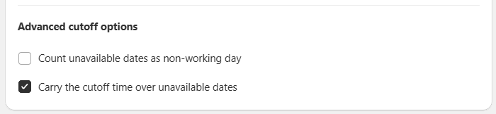 The option above modifies the behaviour of the cutoff time when the following days are unavailable days. Let's say your available days are from Monday to Friday, the First available date is set to 1 day and the cut-off time is 15:00.