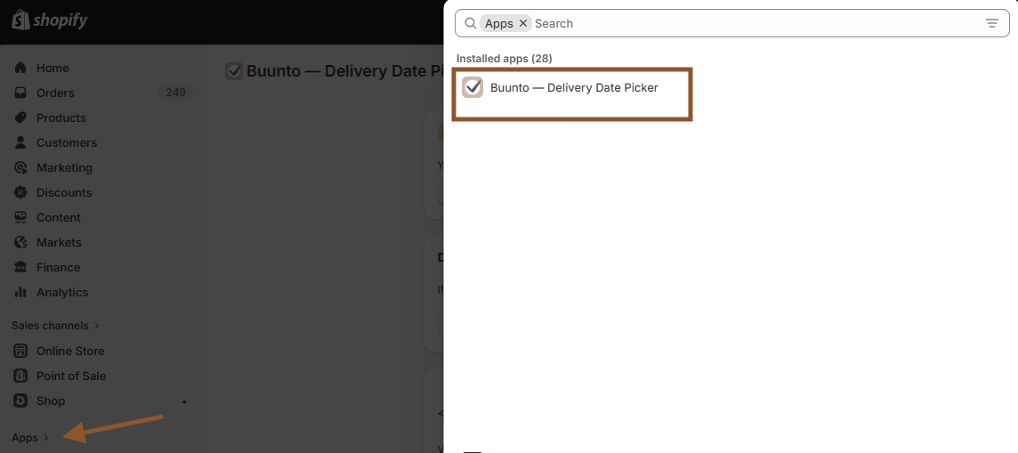 1. Open the admin panel by clicking on Apps then Buunto – Delivery Date Picker