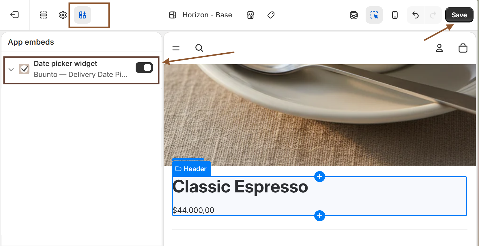 Once, on the Theme Editor, enable "Buunto – Delivery Date Picker" (the switch needs to black), then click Save at the top-right corner.