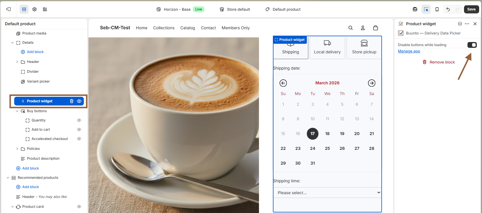 Quick “Add to cart” button. When placing Buunto on the product page you what to make sure the “Quick add” option is disabled on your theme. This button allows you to add a product to the cart without visiting the product page so your customer won’t have a chance to select a date or time. You will find this option in the theme editor in the section displaying products with the quick add button.