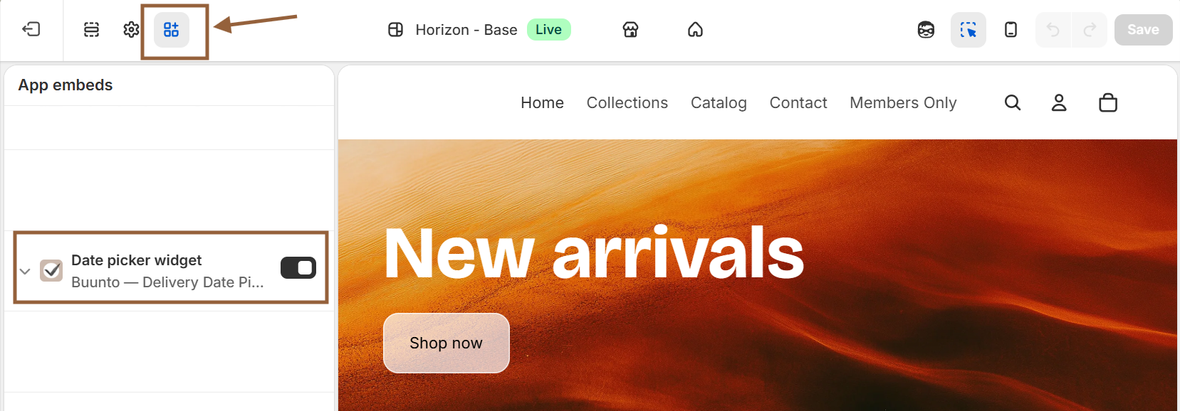 - Click on the App embeds icon