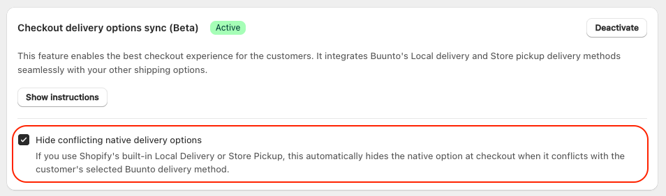 Tip: If you rely on Shopify's built-in local delivery zones (by radius or postcode) to charge different rates based on distance, keep the built-in Local delivery option active and leave the checkbox enabled — Buunto will hide it only when it conflicts with the customer's selection.